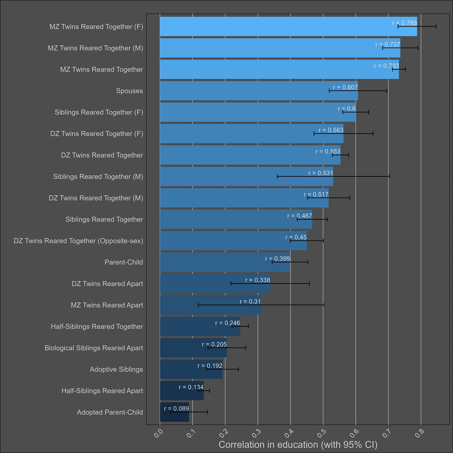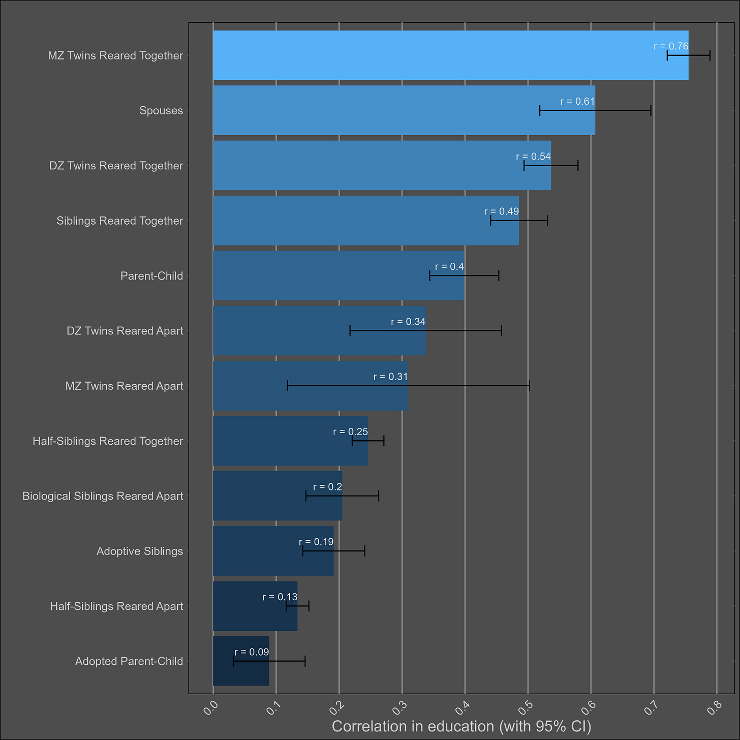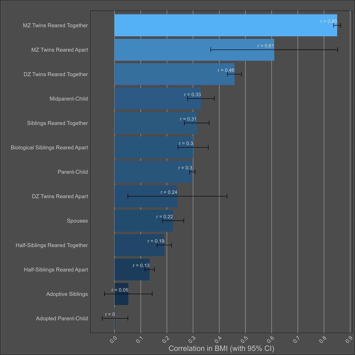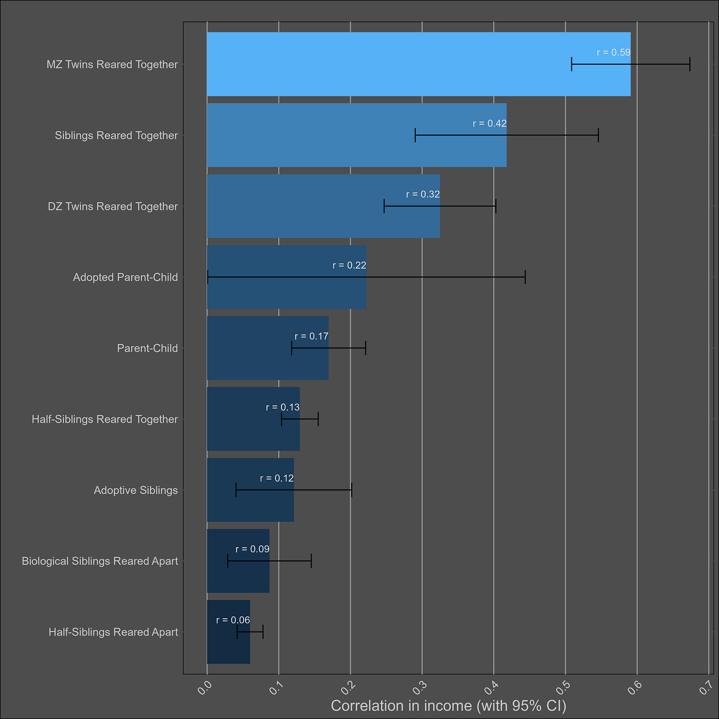 These correlations are misleading, and I was tricked the first time I saw them. Although the correlation between parents and biological children (0.37) is not much higher than the one between parents and adoptive children (0.25), statistical modelling would still imply that genetics matter more than direct phenotypic transmission. This is because the adoptive correlation has to be squared to be turned into a variance component. Therefore, this chart would imply a direct phenotypic transmission estimate of 6.2% (√0.25) and a heritability of 24% (2x(0.37-0.25)). The standard twin method estimates a similar heritability — 32% (2x(0.45-0.29).
