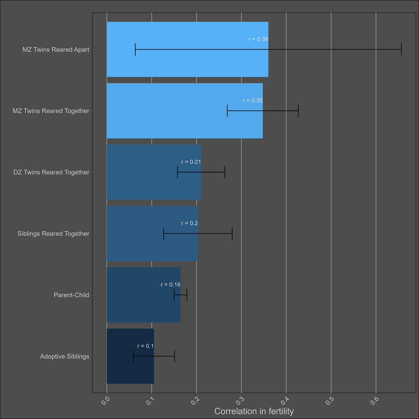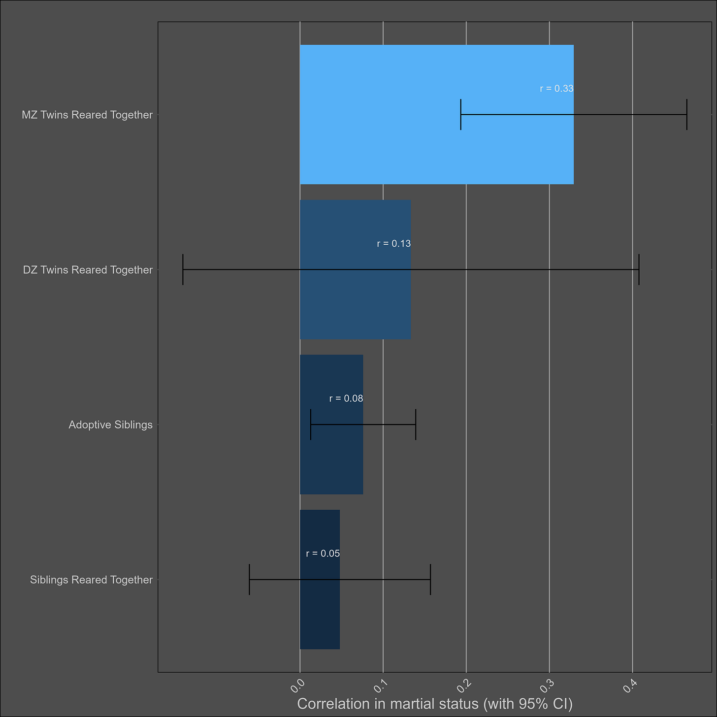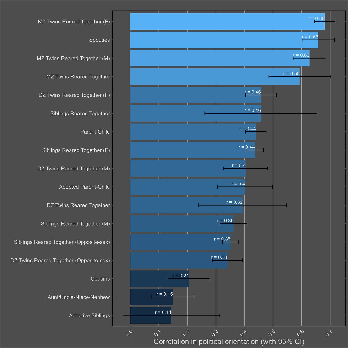 These correlations are misleading, and I was tricked the first time I saw them. Although the correlation between parents and biological children (0.37) is not much higher than the one between parents and adoptive children (0.25), statistical modelling would still imply that genetics matter more than direct phenotypic transmission. This is because the adoptive correlation has to be squared to be turned into a variance component. Therefore, this chart would imply a direct phenotypic transmission estimate of 6.2% (√0.25) and a heritability of 24% (2x(0.37-0.25)). The standard twin method estimates a similar heritability — 32% (2x(0.45-0.29).