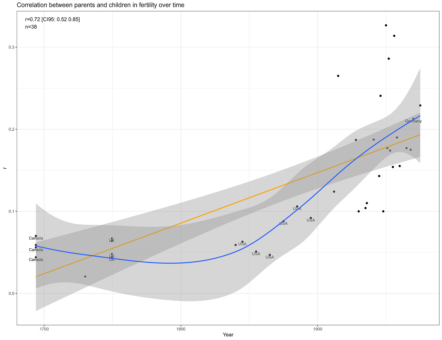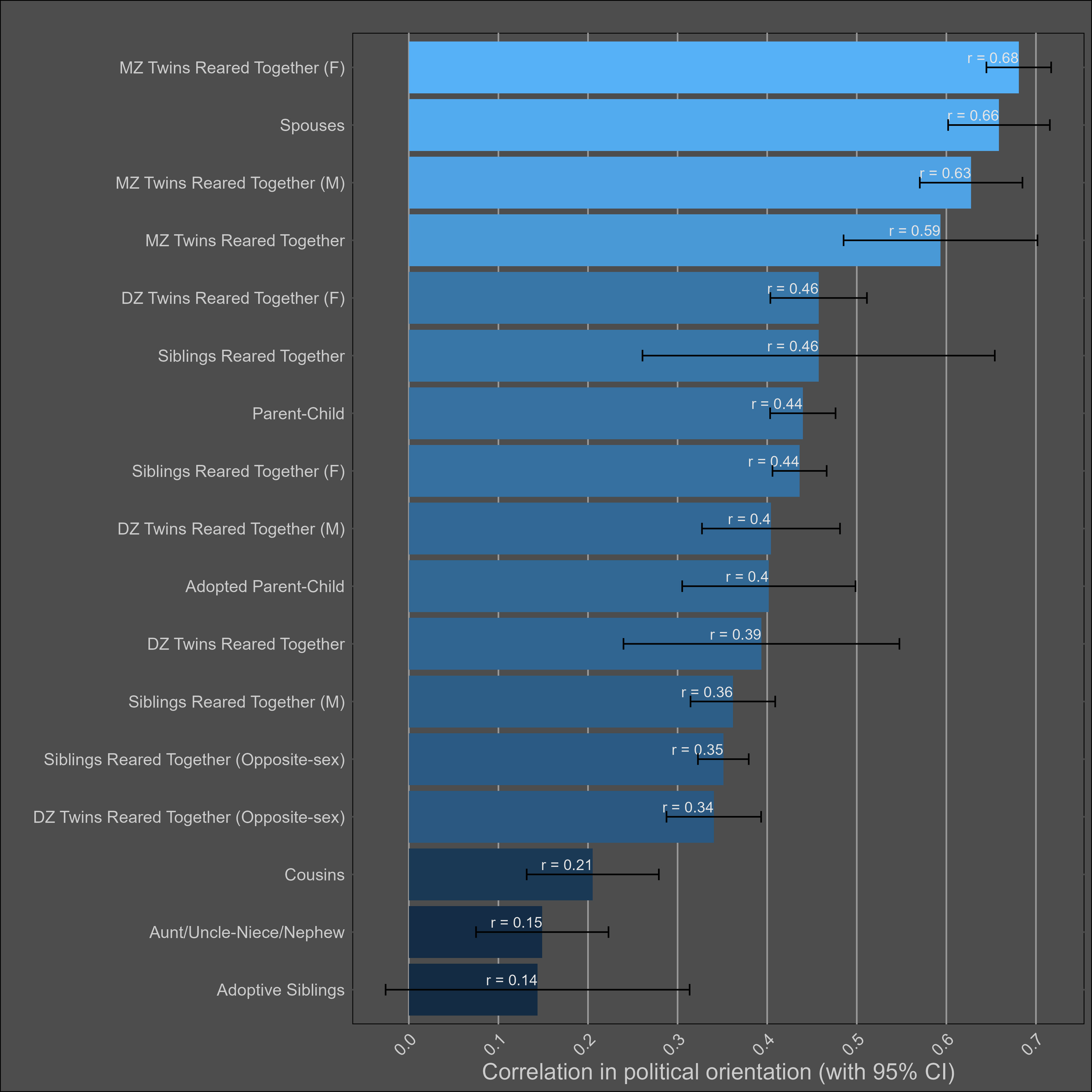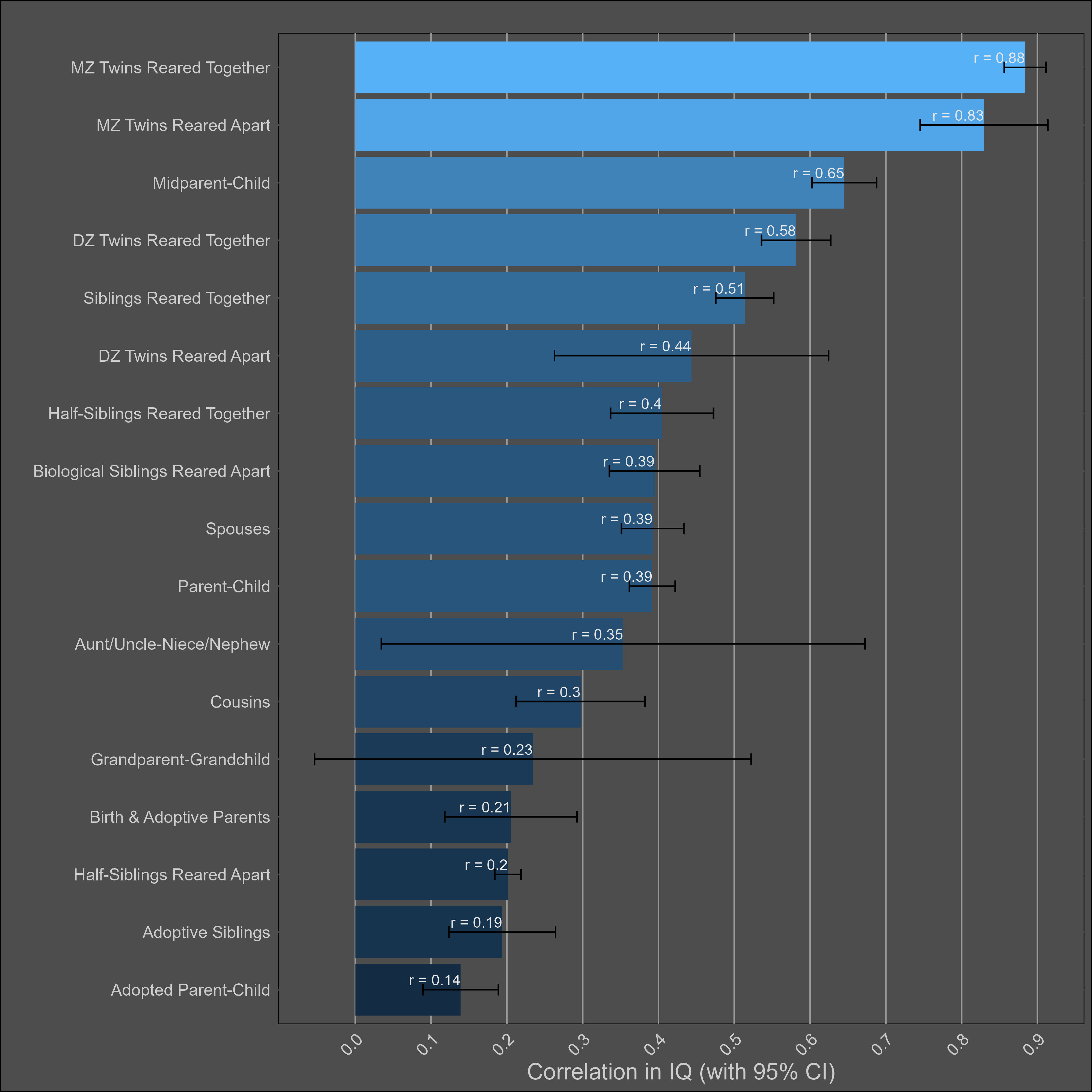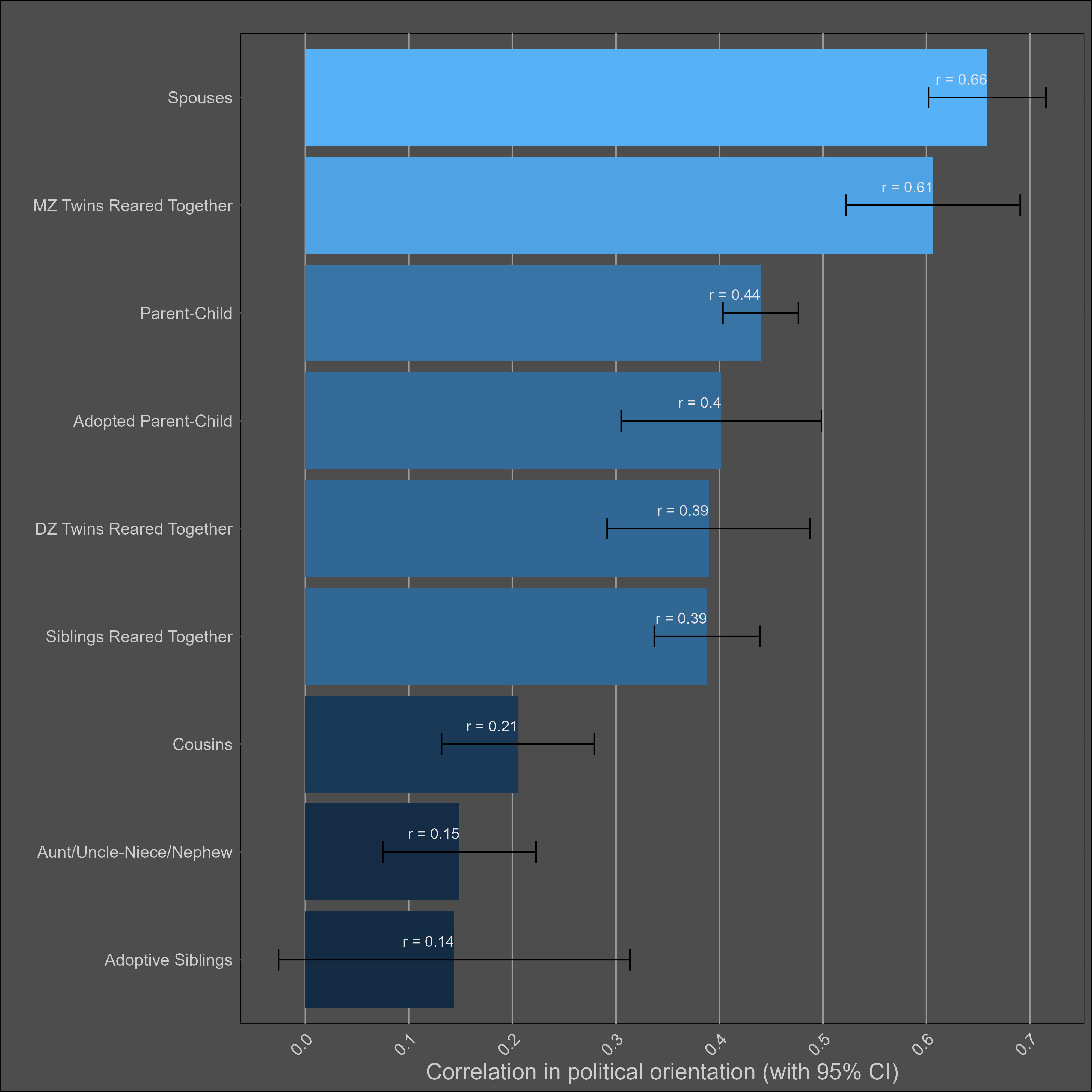 These correlations are misleading, and I was tricked the first time I saw them. Although the correlation between parents and biological children (0.37) is not much higher than the one between parents and adoptive children (0.25), statistical modelling would still imply that genetics matter more than direct phenotypic transmission. This is because the adoptive correlation has to be squared to be turned into a variance component. Therefore, this chart would imply a direct phenotypic transmission estimate of 6.2% (√0.25) and a heritability of 24% (2x(0.37-0.25)). The standard twin method estimates a similar heritability — 32% (2x(0.45-0.29).