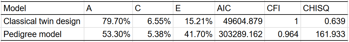 "Twin models give a much higher heritability estimation than a pedigree model that excludes twins reared together: