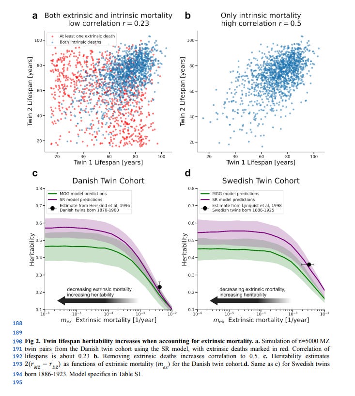 Though it would be misleading to say that, because of this, lifespan has a “true” heritability of 55% — I interpret this as biological ageing having a strong genetic component and extrinsic deaths as having a very small genetic component.