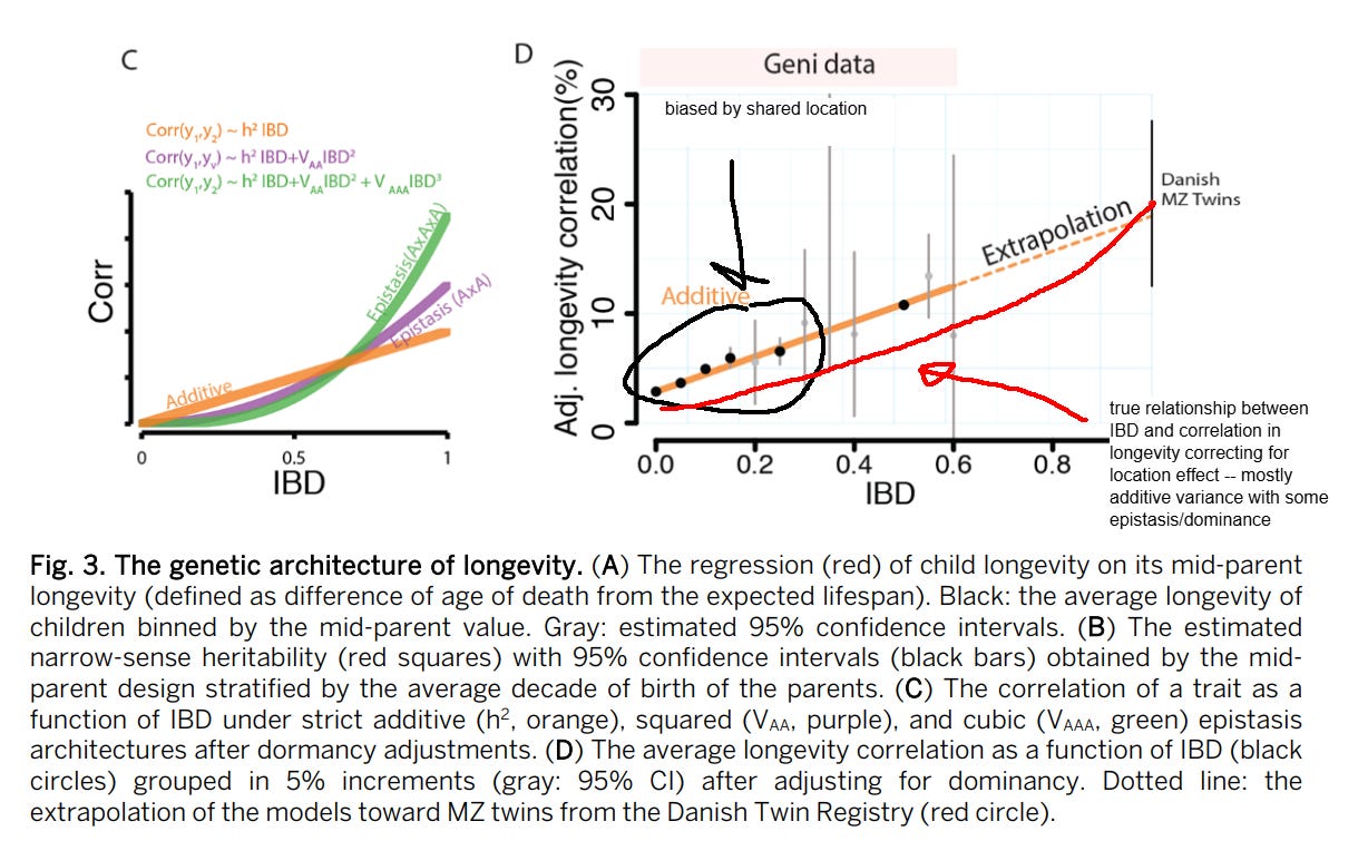Generally I am skeptical of the idea that dominance and epistasis strongly contribute to human variation, but for the case of lifespan I think it’s possible — many monogenic disorders are recessive or dominant and have strong effects on mortality. The presence of genetic disorders that cause people to die at early ages could attenuate the effects of alleles that cause people to die less often of diseases that kill you in your old age.