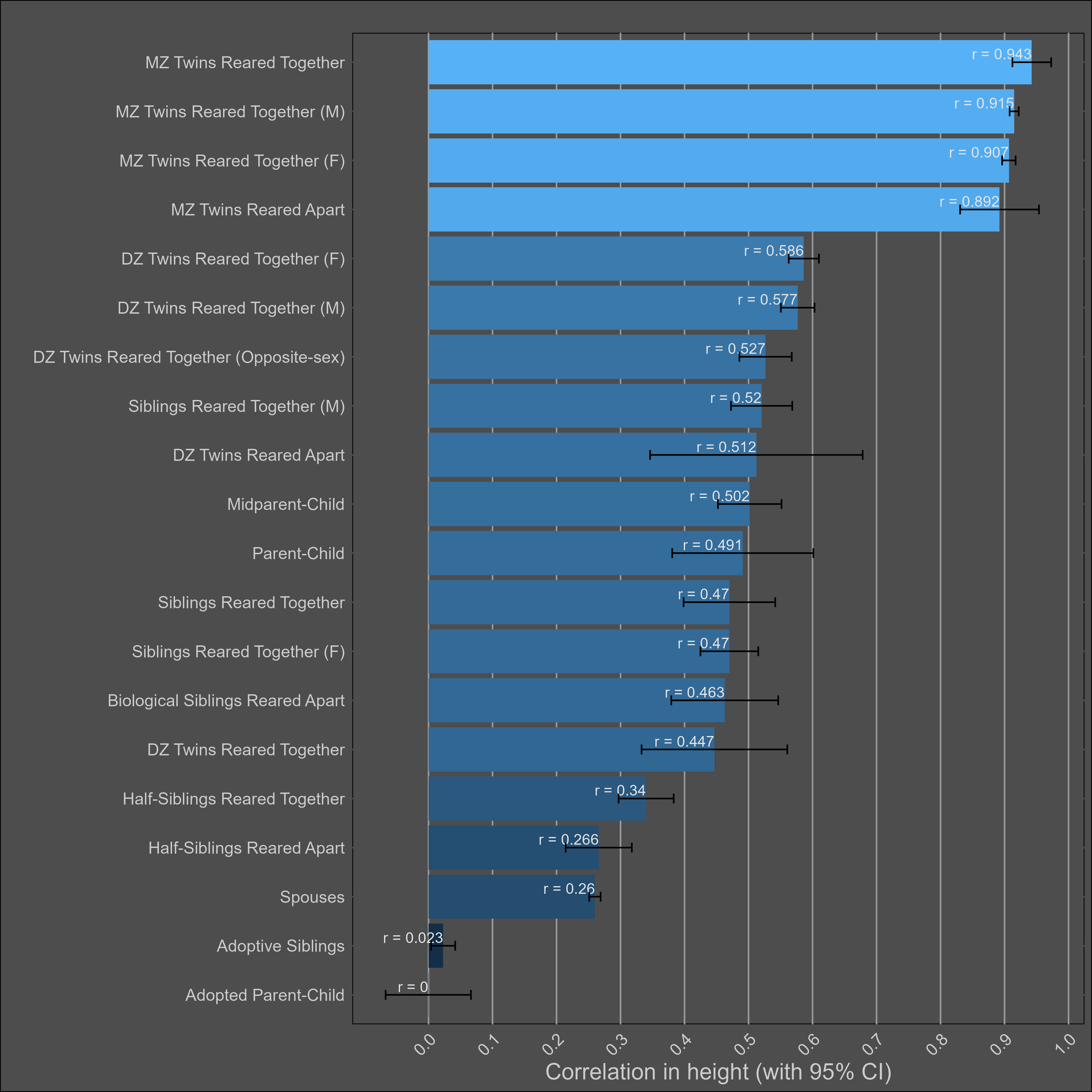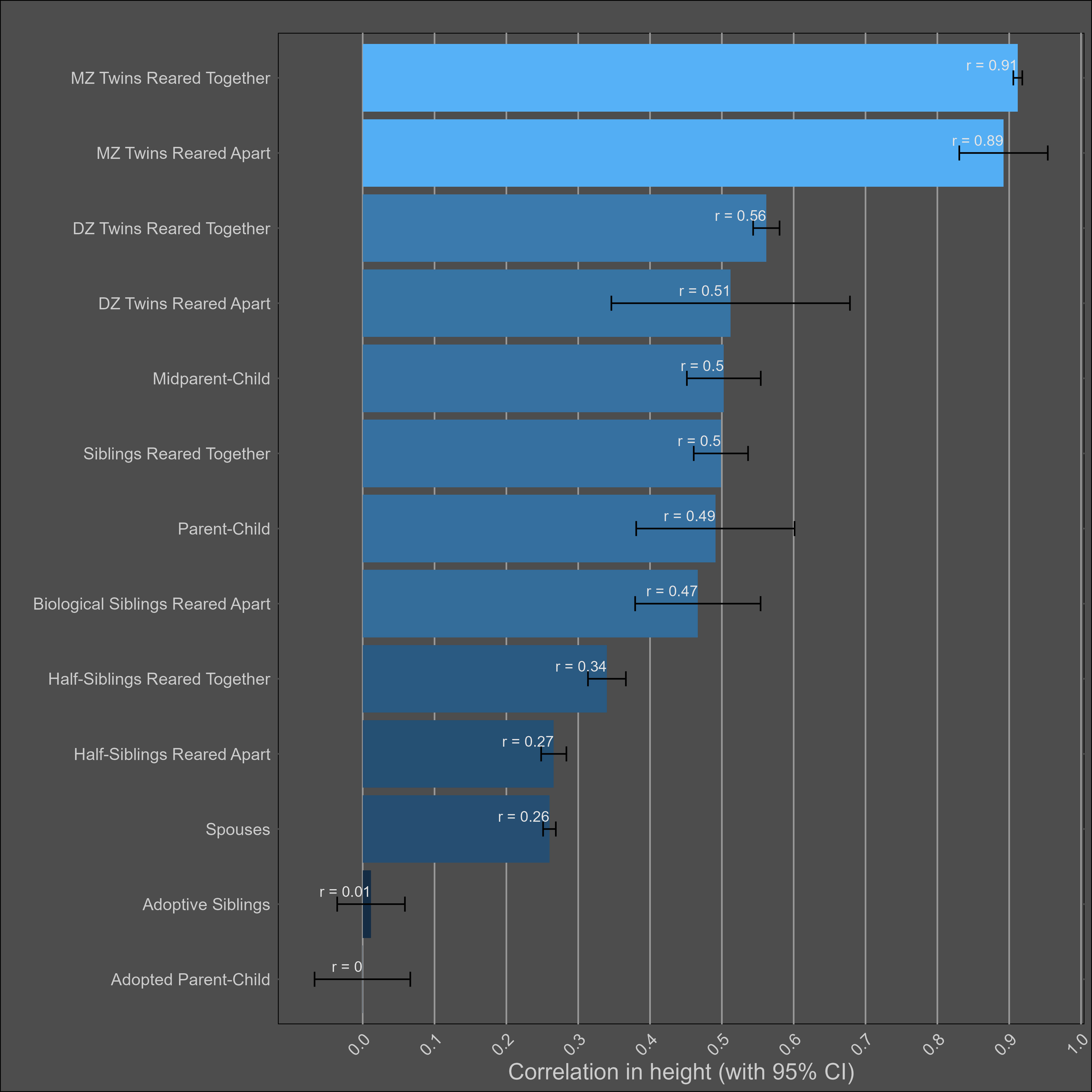 The heritability of height is uncontroversially high. The kin correlations reflect this: