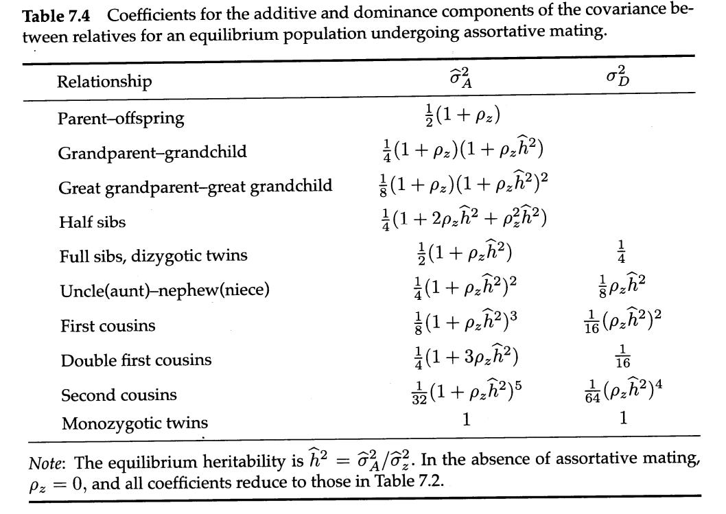In some cases I adjust for assortative mating, which inflates the genetic relationship between relatives. I do this by plugging an assumed narrow-sense heritability and correlation between spouses into the variance components: