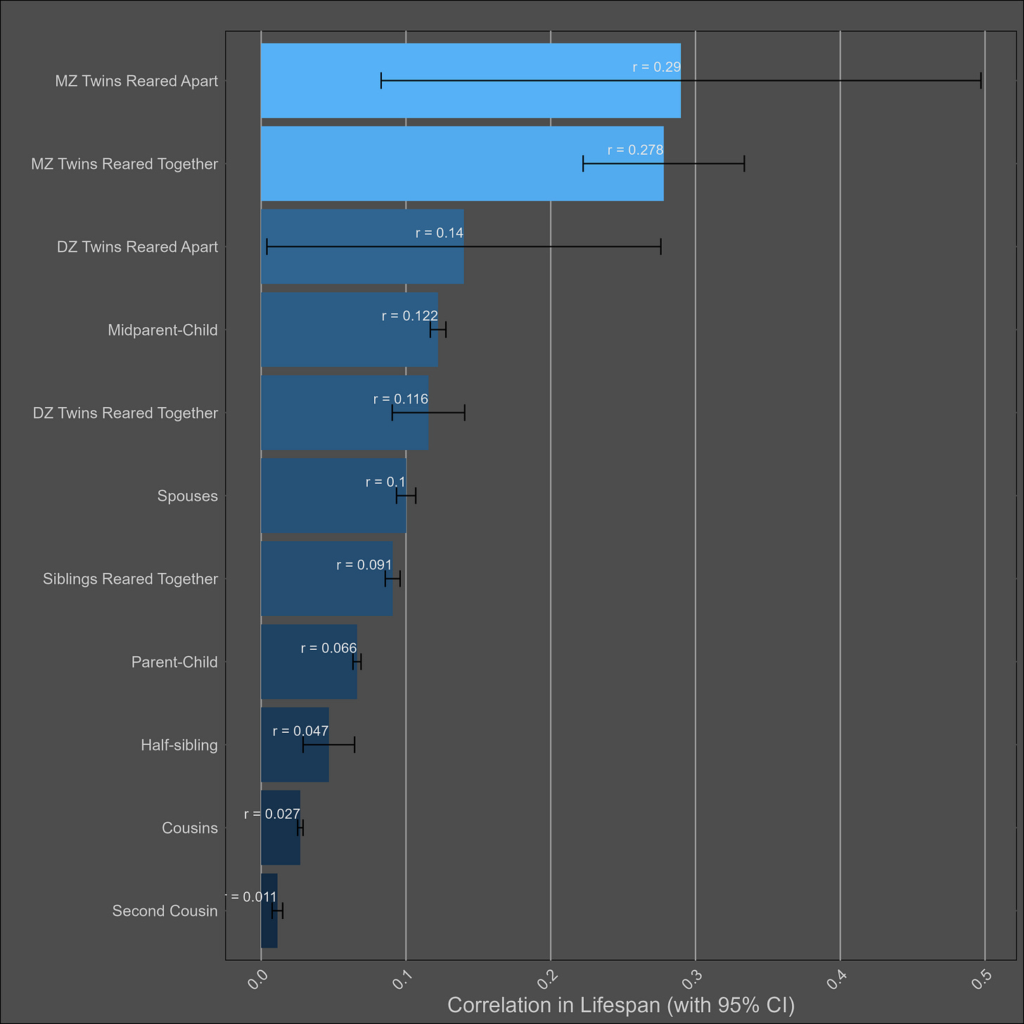 As such, there is very little reason to believe a priori that assortative mating substantially biases estimates of the heritability of lifespan. I didn’t even bother reading most of their paper, since their conclusion was so unbelievable that I thought it was worthless. No statistical model will convince me the earth is flat or that my mom is black.