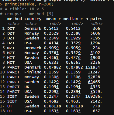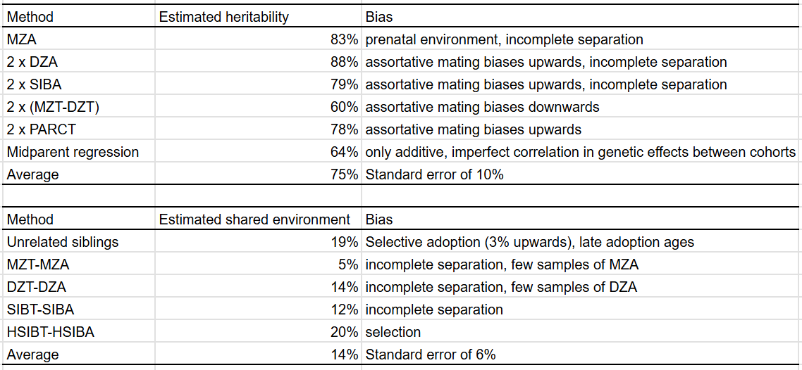 As expected, the methods with upwards bias (MZA, 2xDZA/SIBA/PARCT) all have high heritability estimates, and the ones with downwards biases (falconer formula, midparent regression) have lower ones. The T-A methods diverge, but on average are close to the method of using unrelated siblings.