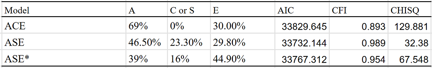 I then ran the ASE model, and got 47% A (additive genes), 23% S (social transmission), and 30% E (unshared environment). Not great, but it’s better than what I got with ACE. I tried a version which adjusted for assortment (p = 0.66 and h^2 = 40%), and got a heritability estimate of 40% instead.