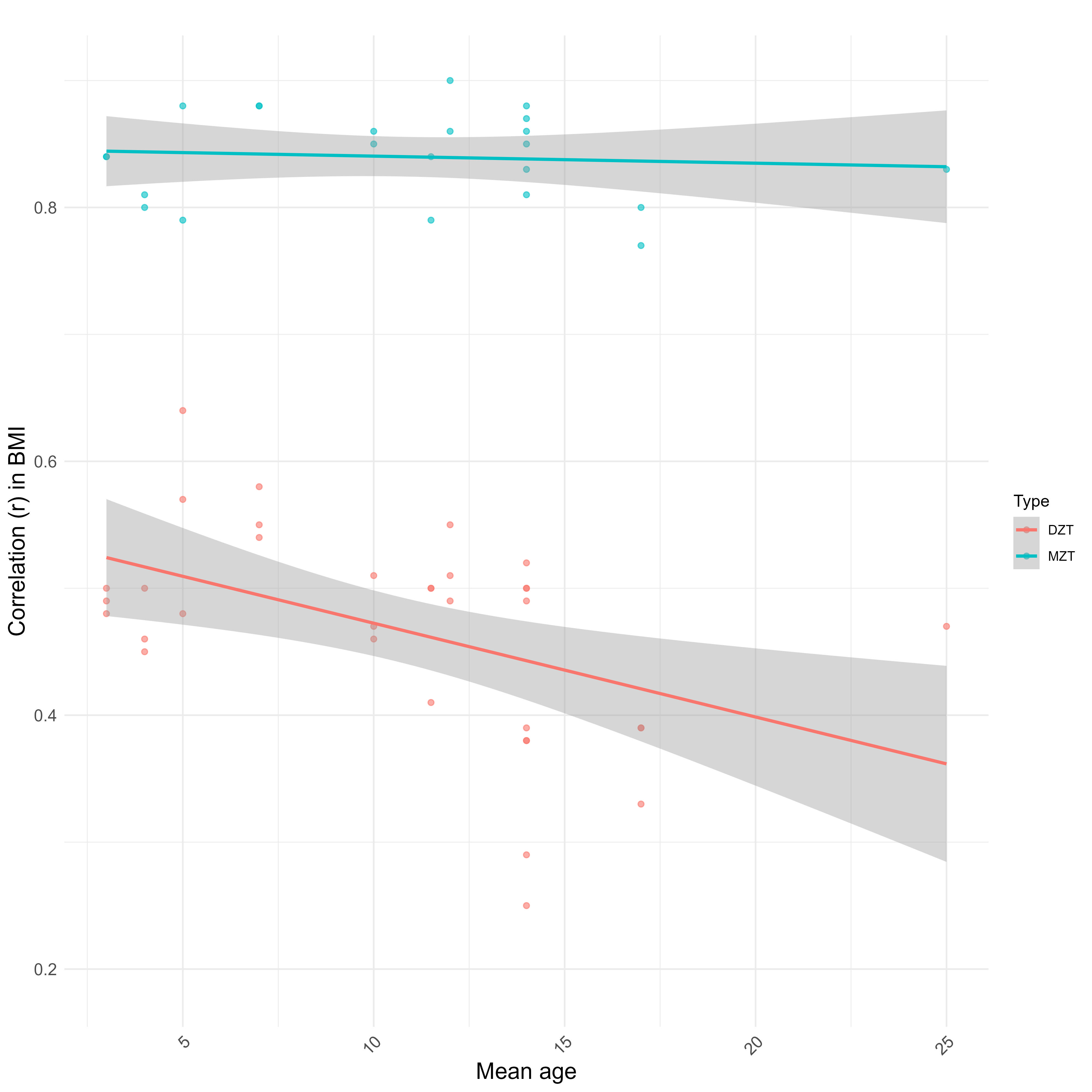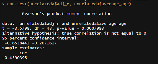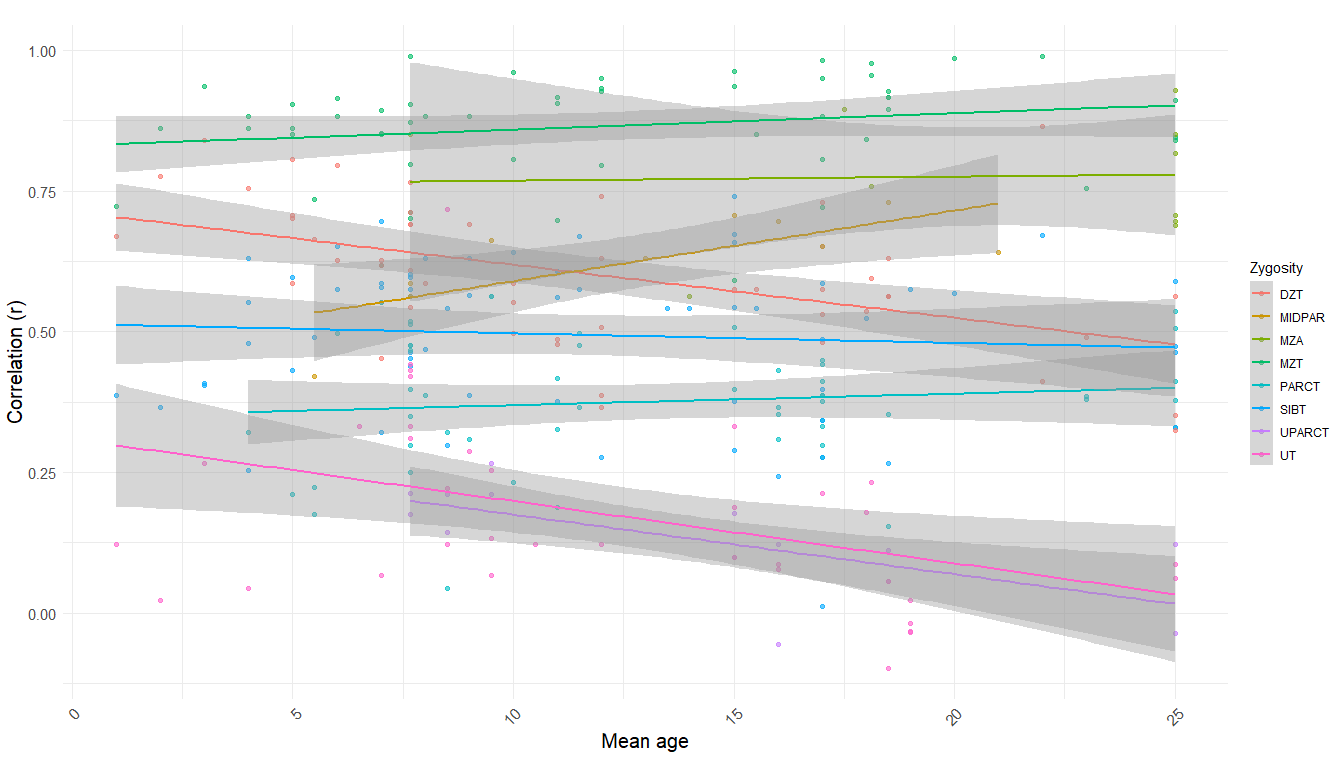 In terms of age trends, the only statistically significant trend was that in DZ twins reared together, dropping from ~.6 in childhood to ~.5 in adulthood. When pooled together, there is a strong negative correlation (r = -.46, p < .001)15 between mean age and relatedness in samples of unrelated individuals reared together (UPARCT and UT).