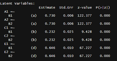 ACE produced non-sensical results (heritability of 69% + unshared environmental component of 30%), so I decided to try something more avant garde. A model which includes a social transmission component, where relatives have the following similarities19: