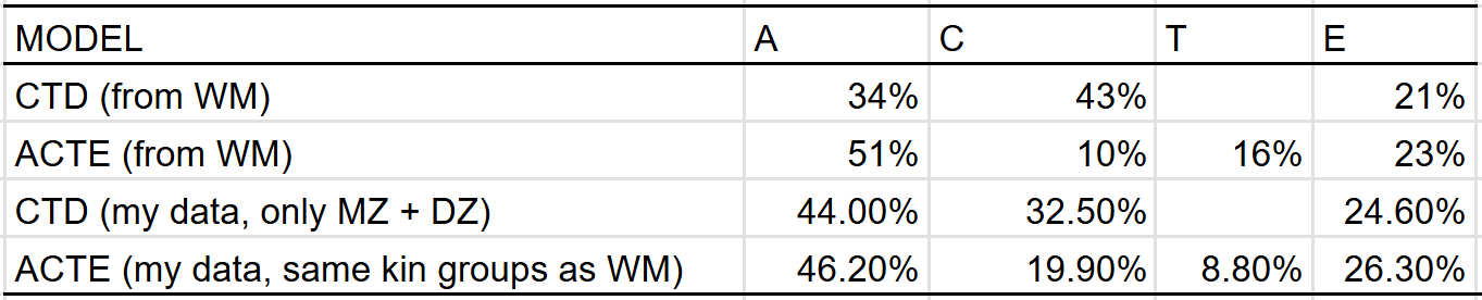 The C^2 and T^2 effects that I estimate differ from those made by Wolfram & Morris, who estimated that the effect of the shared environmental component decreased from 43% to 10% when adjusting for twin-specific effects. This could be due to differences in methodology or underlying data, so I compared the results I would have gotten if I used their methodology, and found that the discrepancy in our results was probably due to differences in underlying data18: