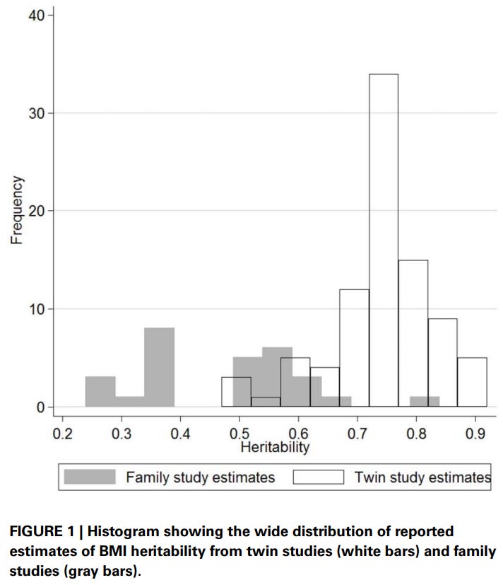 Elk’s meta-analysis of heritability estimates for BMI also found the same thing: