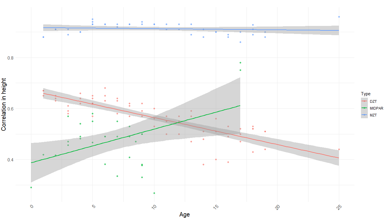 There’s a Wilson effect, where the correlation between DZ twins drops from 0.65 to 0.5 in adult samples:
