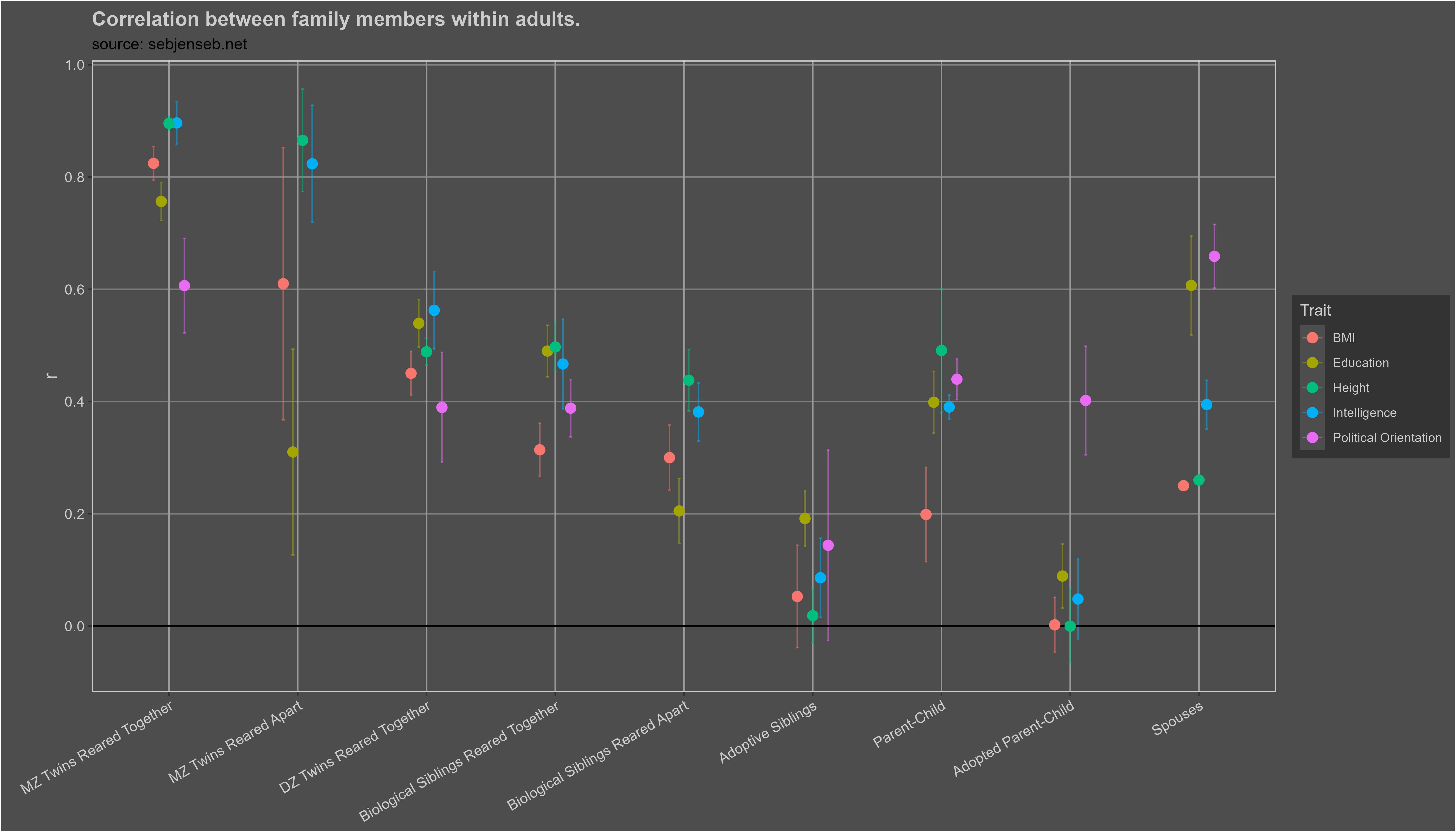 I particularly like the selection of traits I included into the analysis. If you were to see the same chart but for only height/intelligence/education, then some people would think that there is something wrong with the methodology: perhaps adopted parents can’t influence their children the way biological ones can or maybe the children were adopted too late. Adding political orientation to the chart settles both of these doubts and shows that the method can detect parental influence when it does really exist.
