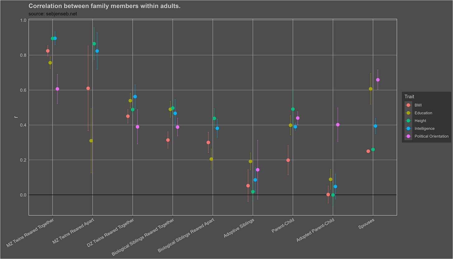 There’s chances the reader will not pick up on that or could even think that the large correlation observed between adopted parents/children is a function of heterogeneity in methodology between studies (for example, maybe the study of political beliefs in adopted parents/children has higher quality measures of political beliefs or less random adoption that results in the correlation being higher relative to other studies).