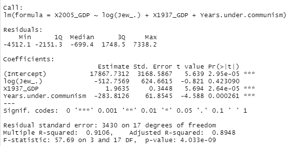 Onto the piece itself, I tested whether the Jewish population fractions in Europe were related to GDP per capita in 2005 when controlling for prior economic development in 1937 and years spent under communist regimes. Using regression models, I concluded that Jews and Europeans had roughly equal influences on the GDP per capita of European nations. I then argued that, given Jews are more intelligent than Europeans, that this suggests that Jews may negatively influence the economy by directing nations towards more socialistic regimes.