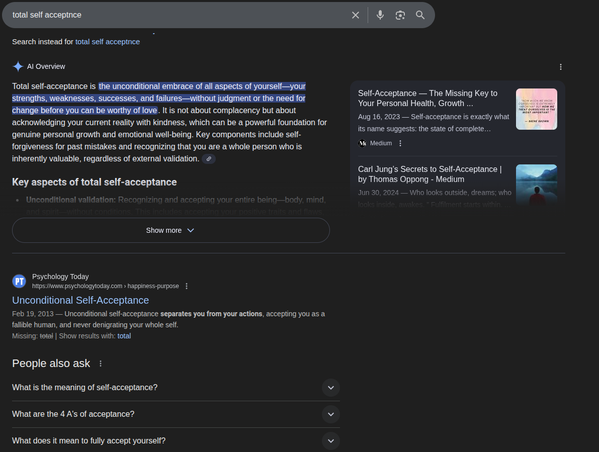 Because insecurity is maligned by contemporary society, “total self acceptance” has become the new thing in spirituality and self-help culture. If one searches for the term, they will find a bunch of psychologists and new-age type coaches explaining what it is and how to reach it. This idea has also gained some traction in the rationalist sphere due to the influence of a certain influencer who I will not name; I just want to emphasise that this is not just a normie pathology.