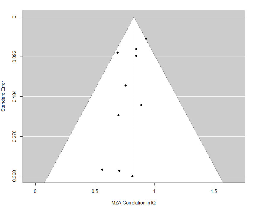No evidence of publication bias was found, which is to be expected, as everybody who has a sample of identical twins reared apart will release the results regardless of what they are.