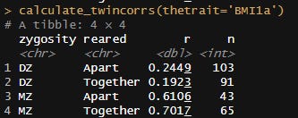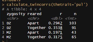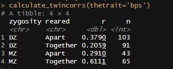 Because I have nowhere else to put them, these are the correlations between twins in other traits. All were adjusted for sex/cohort effects.