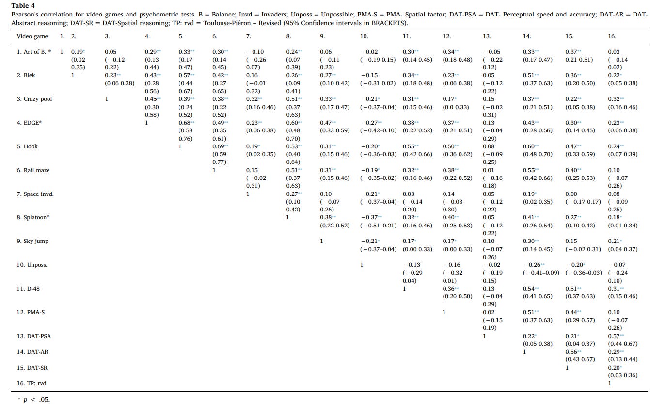 There is another paper that correlates performance on 10 different games with performance on IQ tests, and finds that the correlation is positive in all cases. The correlation between the arithmetic reasoning subtest (most g-loaded subtest in the battery) and performance in the games ranged from 0.19 to 0.60 — so there’s some variation between games in their relationship between performance and g, but some of this variance is definitely due to mere sampling error. The correlation between the latent factor of gaming skill and intelligence was 0.79, though I find that implausible.