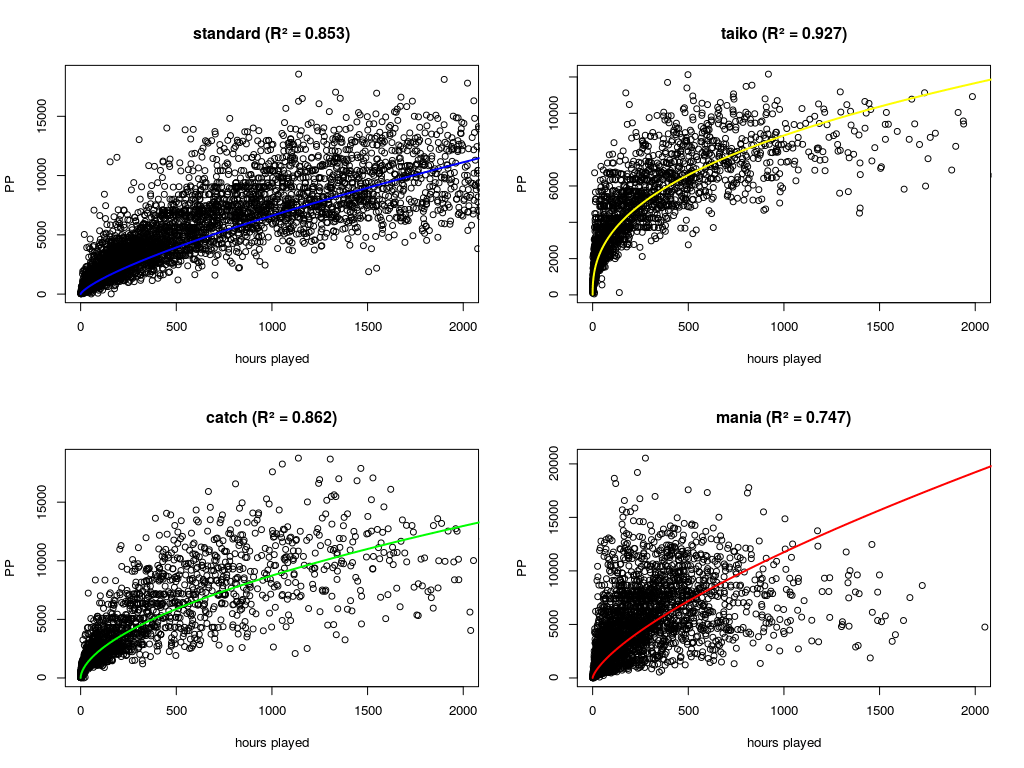 Taken at face value, these three variables account for 40% of the total variation in osu! skill.
