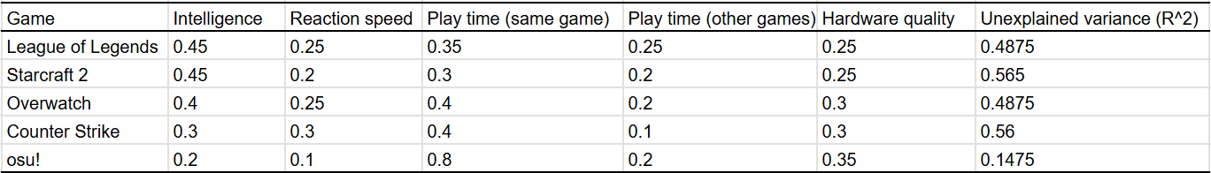 Given that the factors that contribute to game skill clearly differ by game, notably skill at osu! seems to be largely a function of time spent playing, I made an educated guess about how much x variable affects performance in y game: