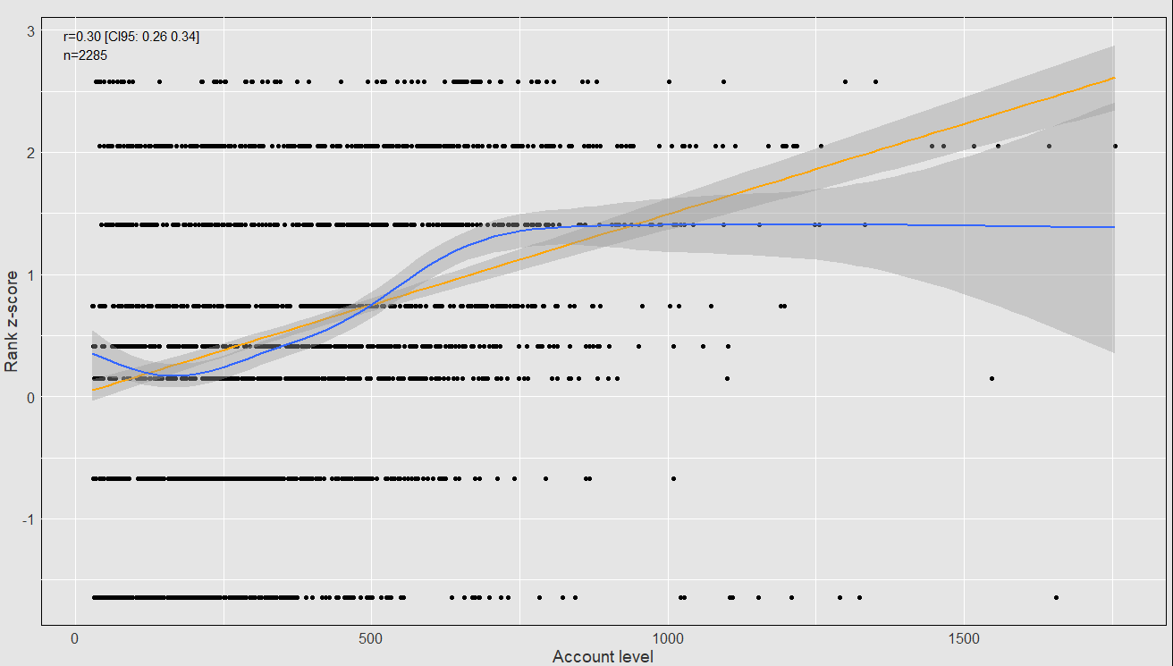 Accounts that are under level 100 are, oddly enough, higher rated than those around level 200, presumably because they are alt accounts. Improvement seems to be nonexistent after one plays enough hours to reach level 750 (somewhere between 4,000 and 8,000 hours, if I had to guess). On average, accounts at the top of the ladder have double the hours of those of those at the bottom of it.