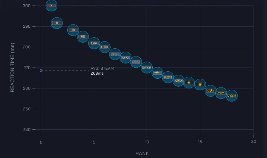 Reaction time is often cited as a reason as to why some players are better than others, though I am of the opinion that it’s overrated. Often, when people do not react to dangers in game, it’s usually because they don’t anticipate them, not because they lack the reflexes to do so. But the logic behind why people with faster reflexes are better at games checks out; people with fast reflexes react about 2 times faster than those with slow reflexes: